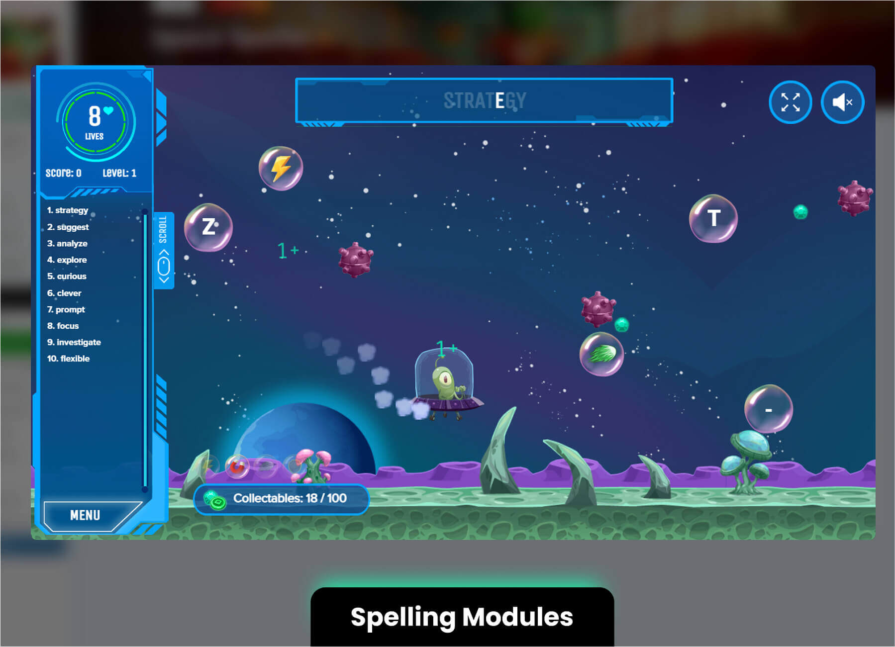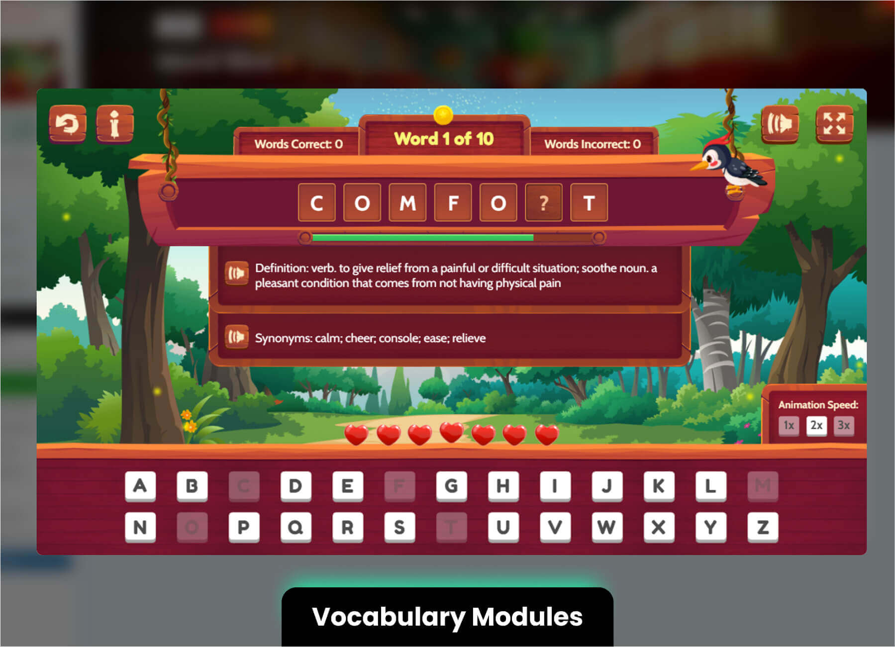Vocab Loco offers students a dynamic hub filled with engaging activities to reinforce vocabulary and spelling skills. When students enter the hub, they have access to a wide range of modules designed to make learning fun and effective.
