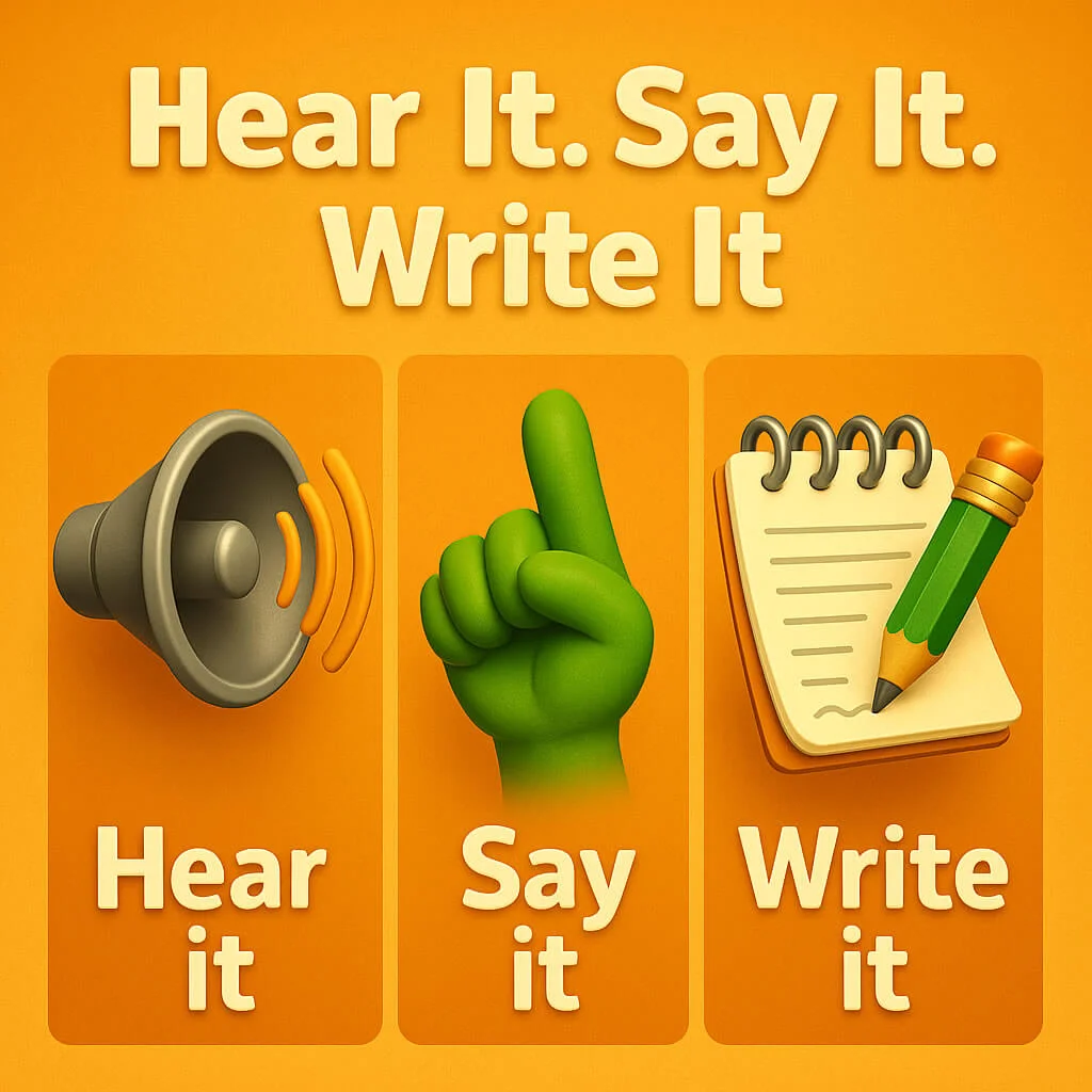Finally, they write the word by hand—whether in print or cursive—engaging muscle memory to strengthen recall and deepen understanding through kinesthetic learning.